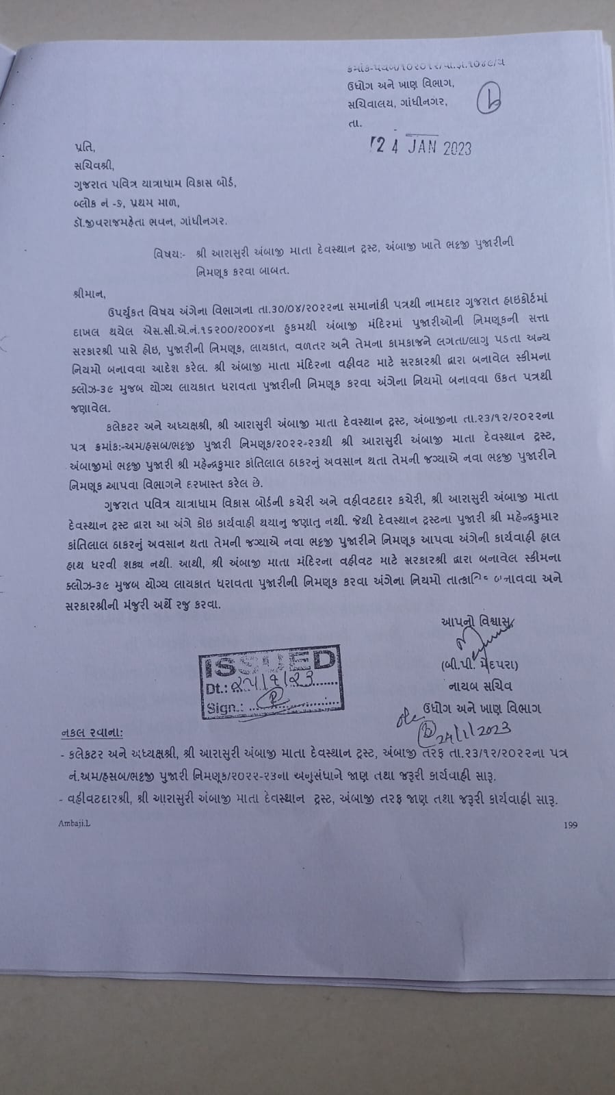 અંબાજી – ખાણ ખનીજ વિભાગ દ્વારા વર્ષ ૨૦૨૩ માં નવા પૂજારી ની નિમણૂક બાબતે અપાયેલ પત્ર અંગે આંખ આડા કાન…
