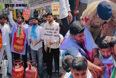 NSUI Protest : અમદાવાદ શહેરના ચાંદલોડિયા વિસ્તારમાં મંગળવારે(17 માર્ચ) નેશનલ સ્ટુડન્ટ્સ યુનિયન ઓફ ઇન્ડિયા(NSUI) દ્વારા સરકાર વિરુદ્ધ ઉગ્ર વિરોધ પ્રદર્શન કરવામાં આવ્યું હતું. કાર્યકરોએ ગેસના ભાવવધારાને ‘અન્યાયી’ ગણાવી સૂત્રોચ્ચાર કર્યા હતા અને ચીમકી આપી હતી કે જો ભાવ પાછા ખેંચવામાં નહીં આવે તો શહેરના તમામ 48 વોર્ડમાં ઉગ્ર આંદોલન કરવામાં આવશે.