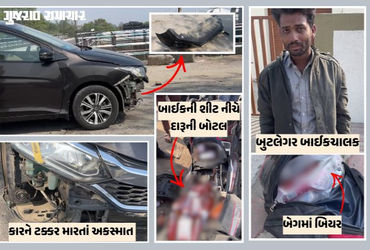 બાઈકચાલકે અતિશય માત્રામાં દારૂ પીધો હતો કે ભાનમાં પણ નહોતો કે શું થયું છે. કારમાં સવાર પરિવાર લગ્ન પ્રસંગમાં જઈ રહ્યો હતો, ત્યારે બાઈકચાલકે ટક્કર મારતા અકસ્માત સર્જાયો હતો. જેને લઈને કારચાલકે બાઈકસવારનું ચેકિંગ કરતાં બાઈક અને તેની બેગમાં દારૂ ભરેલો જોવા મળ્યો હતો. ઘટનાને લઈને કારચાલકે વીડિયો બનાવી વાઈરલ કર્યો હતો. સમગ્ર મામલે કારચાલકે પોલીસને જાણ કરતા પોલીસે બાઈકચાલક બુટલેગરની ધરપકડ કરીને આગળની કાર્યવાહી હાથ ધરી છે.