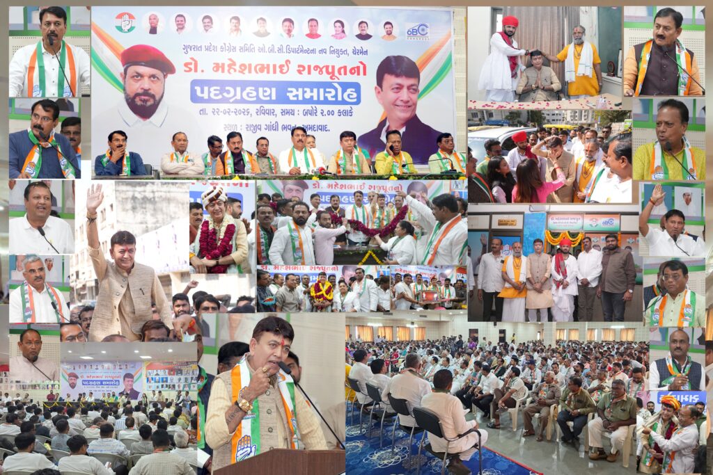 ગુજરાતની પવિત્ર ધરા પર જ્યારે પણ અન્યાય સામે અવાજ ઉઠાવવાની જરૂર પડી છે, ત્યારે ગુજરાતના પછાત વર્ગોએ હરહંમેશ નેતૃત્વ પૂરું પાડ્યું છે. આ જ પરંપરાને આગળ ધપાવતા, તા.૨૨/૦૨/૨૦૨૬ રવિવારે અમદાવાદમાં પાલડી સ્થિત ‘રાજીવ ગાંધી ભવન’ ખાતે એક અભૂતપૂર્વ અને ઐતિહાસિક પદગ્રહણ સમારોહ સંપન્ન થયો. ગુજરાત પ્રદેશ કોંગ્રેસ ઓ.બી.સી. (OBC) ડીપાર્ટમેન્ટના નવનિયુક્ત ચેરમેન ડૉ. મહેશભાઈ રાજપુતનો પદભાર ગ્રહણ કરવાનો આ અવસર માત્ર એક રાજકીય ઘટના નહીં, પરંતુ ગુજરાતના ૫૨ ટકાથી વધુ ઓ.બી.સી. સમાજની અસ્મિતા અને અધિકારો માટેનો એક વિરાટ જન-આંદોલનનો શંખનાદ સાબિત થયો છે.