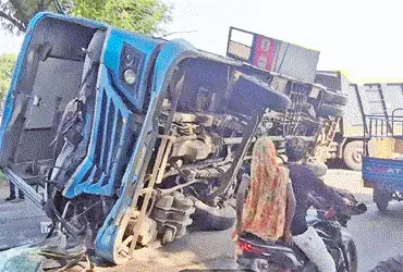 ડમ્પરની ટક્કરને કારણે મોડાસા રૃટની મુસાફરોથી ખીચોખીચ ભરેલી બસ પલટી ખાઈને રોડની