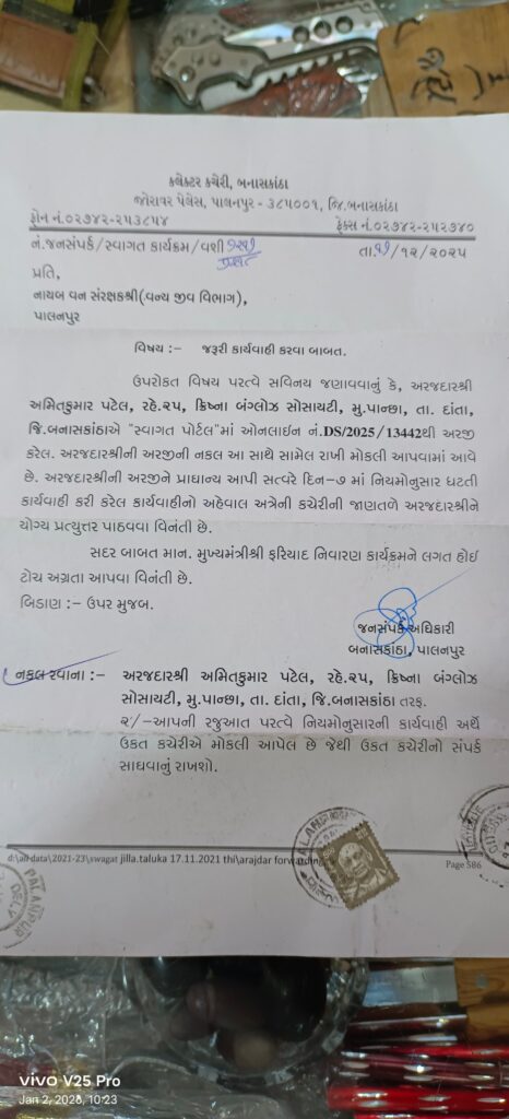 અંબાજી નજીક પાન્સા ગામે આવેલ સર્વે નં.૨ ની ૨.૪૨.૮૨ હે.જમીન મારબલ ઉદ્યોગ માટે વેચાણ કરાયેલ હતી.જે બાબતે અંબાજી ના એક જાગૃત નાગરિક દ્વારા સી.એમ પોર્ટલ માં ફરિયાદ કરાતા ,સી.એમ પોર્ટલ દ્વારા દિવસ ૭ માં ફરિયાદ નો જવાબ આપવા જાણ કરાઈ હતી.