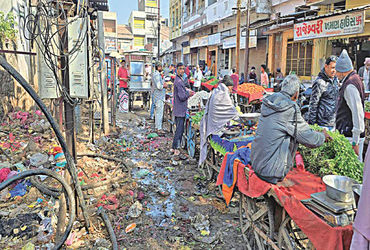 – મનપાને રજૂઆત છતાં રિપેરિંગ હાથ નહીં ધરાતા વેપારીઓ-ગ્રાહકો ગંદા પાણીમાં ઉભા રહેવા મજબૂર