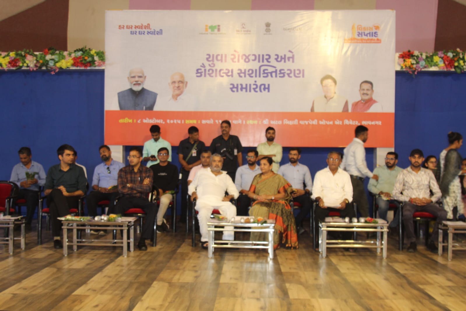 જનહિતકારી સુશાસનની જે ગાથા વડાપ્રધાન શ્રી નરેન્દ્રભાઇ મોદીએ આપી છે તેને જન જન સુધી ઉજાગર કરવાં સમગ્ર રાજ્યમાં તા. ૭ ઓક્ટોબર‌ થી તા.૧૫ ઓક્ટોબર સુધી વિકાસ સપ્તાહ ઉજવણીનું આયોજન કરવામાં આવ્યું છે. જેના ભાગરૂપે આજે ભાવનગર શહેરના શ્રી અટલ બિહારી વાજપેયી ઓપન એર થિયેટર ખાતે ભાવનગર અને બોટાદના સાંસદ તથા ગ્રાહકોની બાબતો, ખાદ્ય અને જાહેર વિતરણ વિભાગ ના કેન્દ્રિય રાજય મંત્રી શ્રીમતી નિમુબેન બાંભણીયાના અધ્યક્ષસ્થાને તેમજ પશુપાલન અને મત્સ્યોદ્યોગ રાજ્ય મંત્રી શ્રી પરષોત્તમભાઈ સોલંકીની પ્રેરક ઉપસ્થિતિમાં ‘યુવા રોજગાર અને કૌશલ્ય સશક્તિકરણ’ સમારંભ યોજાયો હતો.