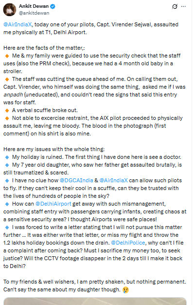 Air India Express Pilot Assaults Passenger: દિલ્હીના ઇન્દિરા ગાંધી ઇન્ટરનેશનલ એરપોર્ટ(T1) પર સુરક્ષા તપાસ દરમિયાન એક પાયલટ દ્વારા સામાન્ય મુસાફર પર હુમલો કરવાની ઘટનાએ ચકચાર મચાવી છે. એર ઇન્ડિયા એક્સપ્રેસના કેપ્ટન વીરેન્દ્ર સેજવાલે કથિત રીતે અંકિત દીવાન નામના મુસાફર પર હુમલો કર્યો હતો, જેના કારણે મુસાફરના ચહેરા પર ગંભીર ઈજાઓ થઈ હતી અને તે લોહીલુહાણ થઈ ગયો હતો. આ ઘટના બાદ એરલાઇને તાત્કાલિક પગલાં ભરીને આરોપી પાયલટને તપાસ પૂરી ન થાય ત્યાં સુધી ફરજ પરથી સસ્પેન્ડ કરી દીધો છે.