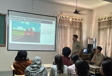 આરટીઓ ઇન્સ્પેક્ટર એસ.પી. સુથાર અને આસિસ્ટન્ટ ઇન્સ્પેક્ટર કે .પી. જીયાણી દ્વારા પ્રેઝન્ટેશન થકી રોડ સેફટીને લગતી માહિતી તેમજ માગદર્શન વિદ્યાર્થીઓને આપવામાં આવ્યું હતું. જેમાં હેલ્મેટ અને સીટબેલ્ટનો ઉપયોગ કરવા, વળાંક વખતે અથવા લાઈન ચેન્જ કરતા સમયે સાઈડ લાઈટનો ઉપયોગ કરવા, બ્રેકની ચોકસાઈ અંગે, બે વાહન વચ્ચે અંતર જાળવવા, થાક અથવા અપૂરતી ઊંઘ ડ્રાઇવિંગ માટે જોખમી, સગીર વયે ડ્રાઇવિંગના કાયદાની જોગવાઈ સહિતની બાબતો અંગે વિસ્તૃત માહિતી પૂરી પાડી માર્ગદર્શન આપ્યું હતું. આજે અકસ્માતમાં અનેક વ્યક્તિઓ જીવ ગુમાવી રહી છે, છતાં ટ્રાફિક નિયમો દરેક લોકો ફોલો કરતા નથી.