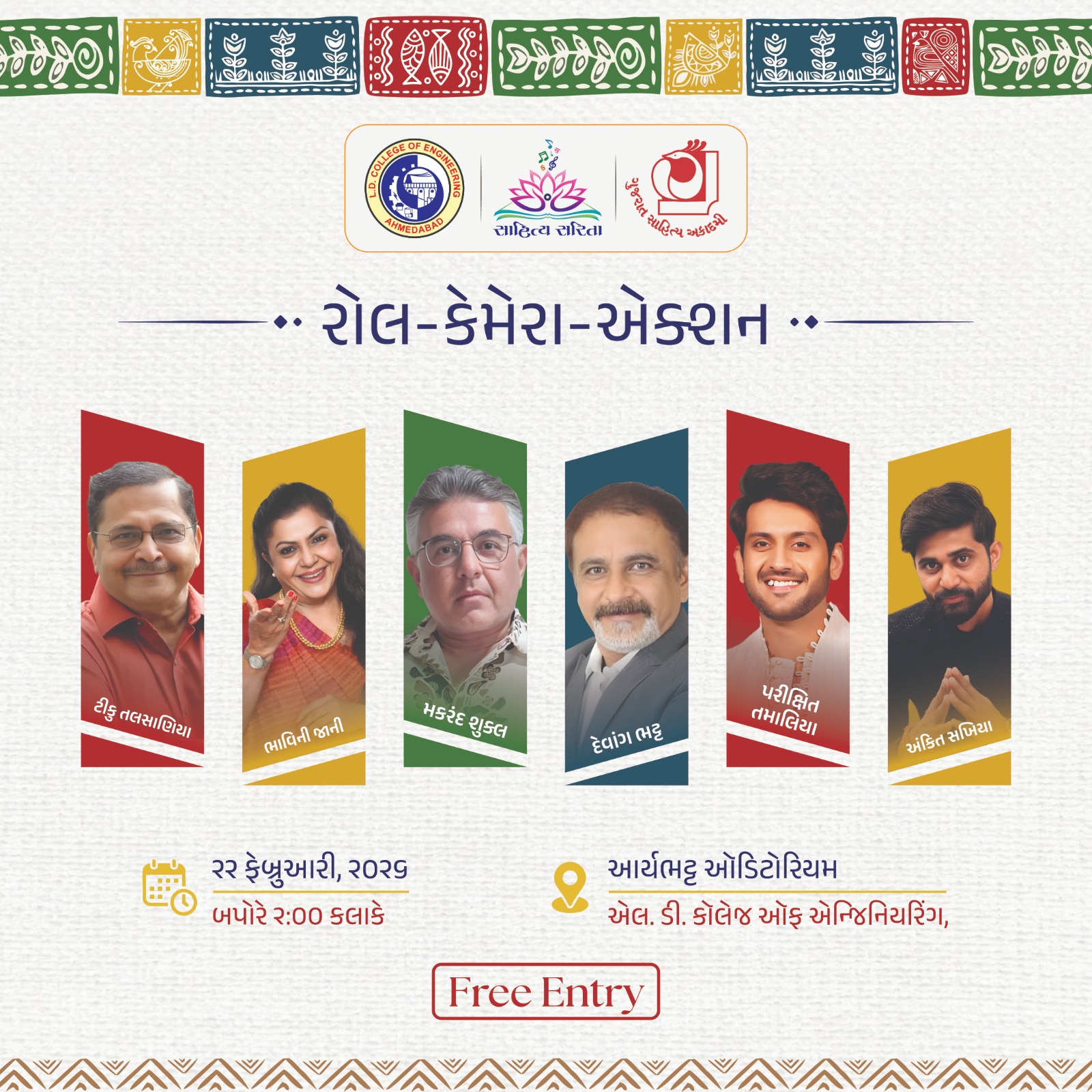 એલ. ડી. કૉલેજ ઑફ એન્જિનિયરિંગ અને ગુજરાત સાહિત્ય અકાદમીના સંયુક્ત ઉપક્રમે આયોજિત “સાહિત્ય સરિતા ૨૦૨૬” અંતર્ગત “રોલ – કેમેરા – એક્શન” નામે વિશેષ કાર્યક્રમ ૨૨ ફેબ્રુઆરી, ૨૦૨૬ના રોજ આર્યભટ્ટ ઓડિટોરિયમ, એલ.ડી. કોલેજ ઓફ એન્જિનિયરિંગ, અમદાવાદ ખાતે સફળતાપૂર્વક યોજાયો હતો.