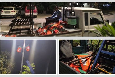 રાત્રે વીજ પોલ પર ઝંડા લગાવતા કર્મચારીઓ