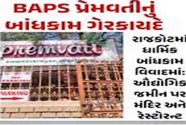 રાજકોટ, : રાજકોટના ગોંડલરોડ પર વાવડી વિસ્તારમાં 5 વર્ષથી ધમધમતા પ્રેમવતી રેસ્ટોરન્ટ અને આસપાસમાં ઓફિસ વગેરેના અનધિકૃત બાંધકામ અંગે મામલતદારની સ્થળ તપાસ બાદ બોચાસણવાસી અક્ષર પુરૂષોતમ સ્વામિનારાયણ સંસ્થાના શાસ્ત્રી શેરી નારાયણ સ્વરૂપદાસજી વિરૂધ્ધ જિલ્લા મેજિસ્ટ્રેટની કોર્ટમાં કેસ ચાલી જતા જિલ્લા કલેક્ટર ડો.ઓમ પ્રકાશે પૂરાવાઓ લક્ષ્યમાં લઈને શરતભંગ સાબિત હોવાનું પૂરવાર થતા બી.એ.પી.એસ.સંસ્થાને રૂ।.૧૩.૧૩ લાખનો દંડ ભરવા તેમજ આ સ્થળે અનધિકૃત બાંધકામ અંગે મહાપાલિકા તથા નેશનલ હાઈવે ઓથોરિટીને આગળની કાર્યવાહી કરવા આજે હુકમ જારી કર્યો છે.