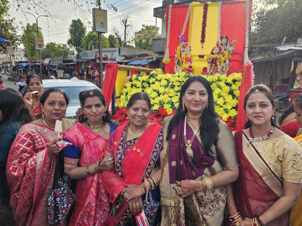 ગીતો ગાય છે અને કળશ સાથે શોભાયાત્રા કાઢે છે.અંબાજીના રાધા કૃષ્ણ મંદિર થી ભવ્ય શોભાયાત્રા કાઢવામાં આવી હતી.અંબાજીના બજારોમાં થી નીકળી અગ્રવાલ ધર્મશાળા સુધી શોભાયાત્રા નીકળી હતી.મહિલાઓ ગરબા સાથે ભક્તિ કરતી જોવા મળી