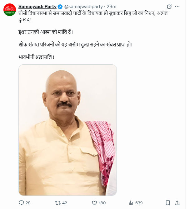 Sudhakar Singh Died News : ઉત્તર પ્રદેશના મઉ જિલ્લાની ઘોસી વિધાનસભા બેઠક પરથી સમાજવાદી પાર્ટી (SP)ના ધારાસભ્ય સુધાકર સિંહનું નિધન થયું છે. 60 વર્ષીય સુધાકર સિંહને બે દિવસ પહેલા છાતીમાં દુખાવાની ફરિયાદ બાદ લખનઉની એક હોસ્પિટલમાં દાખલ કરવામાં આવ્યા હતા, જ્યાં સારવાર દરમિયાન તેમણે અંતિમ શ્વાસ લીધા. સમાજવાદી પાર્ટીએ પોતાના સત્તાવાર સોશિયલ મીડિયા હેન્ડલ પર આ દુઃખદ સમાચારની જાણકારી આપી હતી.