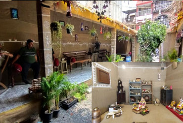 ગામની શેરી, ઓસરી, ઘર બહાર રોપાયેલા છોડ, ઘર બહાર ગાડું મૂકવામાં આવ્યું છે અને તેની નજીક કૂવો બનાવવામાં આવ્યો છે. ઘરના દરવાજામાં પ્રવેશવા સાથે ઓસરી બહાર રોપાયેલા છોડ, વૃક્ષ તુલસી ક્યારો સહિતનું દૃશ્ય જોવા મળે છે. આ ઉપરાંત ઘરમાં પ્રવેશતાં જ ગામડામાં હોય તેવા બાંકડા, ટેબલ, પટ્ટી વાળો ખાટલો, નાની સંદૂક પણ મૂકવામાં આવી છે. આ ઉપરાંત ઘરમાં જે દીવાલ બનાવવામાં આવી છે તે દીવાલ છાણથી લીંપેલી બતાવવા શણના કાપડનો ઉપયોગ કરવામાં આવ્યો છે અને તેના પર વારલી પેઇન્ટીંગ કરવામાં આવ્યું છે.