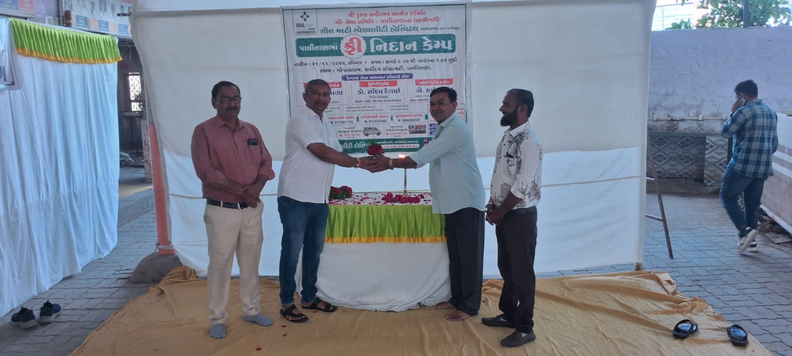 પવિત્ર યાત્રા ધામ પાલીતાણા માં વર્ષોથી સેવાકીય પ્રવુતિ સાથે શકાળયેલ શ્રી કૃષ્ણ ધર્મોત્સવ પ્રદર્શન સમિતિ ગૌ-સેવા સમિતિ – પાલીતાણાના દ્વારા સૌલ મલ્ટી સ્પેશ્યાલીટી હોસ્પિટલ ભાવનગર દ્વારા આયોજીત પાલીતાણામાં ગોપાલધામ, સર્વોદય સોસાયટી ખાતે ફ્રી નિદાન કેમ્પનું આયોજન કરવામાં આવ્યુ હતુ દીપ પ્રગટેકરી આ કંપની ખુલ્લો મુકવામાં આવ્યો હતો