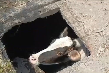 વડોદરાઃ હરણીરોડ વિસ્તારની ખુલ્લી ગટરમાં આજે એક ગાય ખાબકતાં ફાયર બ્રિગેડના જવાનોએ તેને બહાર કાઢી હતી.