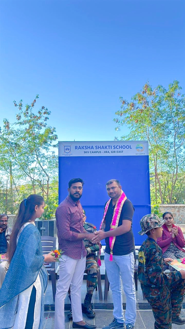 રક્ષા શક્તિ સ્કૂલ, જીરા (ગીર પૂર્વ), અમરેલી ખાતે આજે એક અત્યંત ગૌરવભર્યો, ભાવનાત્મક અને રાષ્ટ્રપ્રેમથી ઓતપ્રોત દિવસ ઉજવાયો. દેશસેવામાં જીવન અર્પણ કરનાર મકવાણા ભાવેશભાઈ, ગ્રેનેડિયર રેજીમેન્ટના નિવૃત્ત સિપાઈ, ખાસ કરીને રક્ષા શક્તિના વિદ્યાર્થીઓને મળવા માટે શાળામાં પધાર્યા હતા. તેમનું આગમન માત્ર એક મુલાકાત નહીં પરંતુ દેશભક્તિ, શિસ્ત અને બલિદાનના જીવંત પાઠ સમાન હતું.